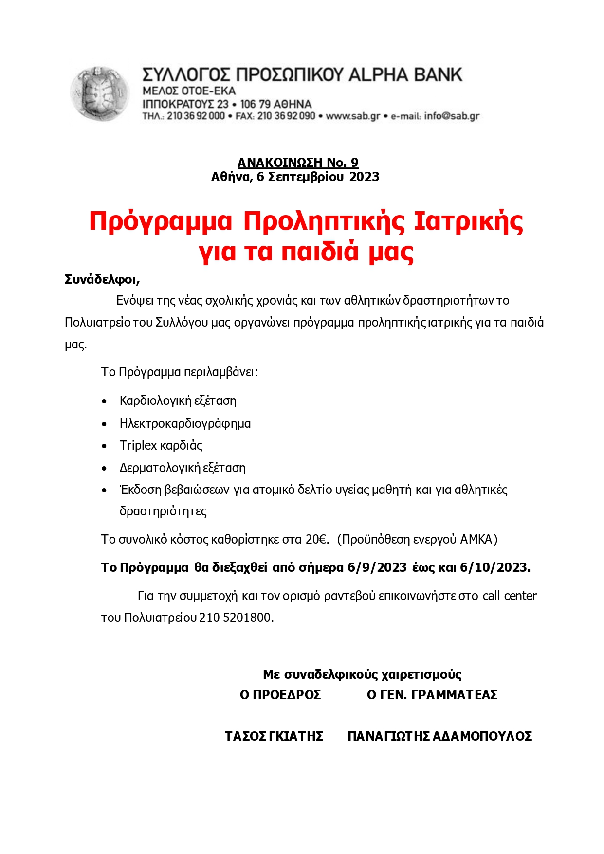 ΝΕΑ Κοινοποίηση: Πρόγραμμα Προληπτικής Ιατρικής για τα παιδιά μας 6 September, 2023 0 78 Share FacebookTwitterWhatsAppEmail Πρέπει να διαβάσετε Δώρο Χριστουγέννων 5 December, 2025 Η κακοκαιρία και τα δικαιώματα του εργαζόμενου 4 December, 2025 Επιχειρήσεις που εφαρμόζουν σύστημα πενθήμερης εβδομαδιαίας εργασίας: Πότε οι εργαζόμενοι μπορούν να εργασθούν νομίμως και την έκτη ημέρα της εβδομάδας; 15 October, 2025 Σημαντική αύξηση των καταγγελιών βίας και παρενόχλησης στην εργασία 3 June, 2025 Η παροχή ισχύει και για τα μέλη του Συλλόγου Προσωπικού Cepal Hellas. Κοινοποίηση ανακοίνωσης Συλλόγου Προσωπικού Alpha Bank Share FacebookTwitterWhatsAppEmail Previous articleΕΠΕΙΓΟΥΣΑ ΕΝΗΜΕΡΩΣΗ: Άμεση ανάγκη για αιμοπετάλιαNext articleΗ πρώτη Ομοσπονδία servicers στην Ελλάδα είναι γεγονός Τελευταία νέα Την Τρίτη 16 Δεκεμβρίου 2025 η πρώτη Ομοσπονδία Οργανώσεων Servicers Ελλάδος έγινε πραγματικότητα 18 December, 2025 Δώρο Χριστουγέννων 5 December, 2025 Η κακοκαιρία και τα δικαιώματα του εργαζόμενου 4 December, 2025 Την Τρίτη 16 Δεκεμβρίου 2025 η πρώτη Ομοσπονδία Οργανώσεων Servicers Ελλάδος γίνεται πραγματικότητα 3 December, 2025 Εθνική κοινωνική συμφωνία για την επιστροφή των ΣΣΕ 26 November, 2025